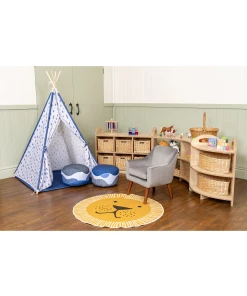 | This lovely shelving unit offers 8 compartments to store resources, and books in. The unique design adds an interesting element to any nursery, or reading nook! Compatible to use with our baskets or tubs for hidden storage- available separately to purchase.